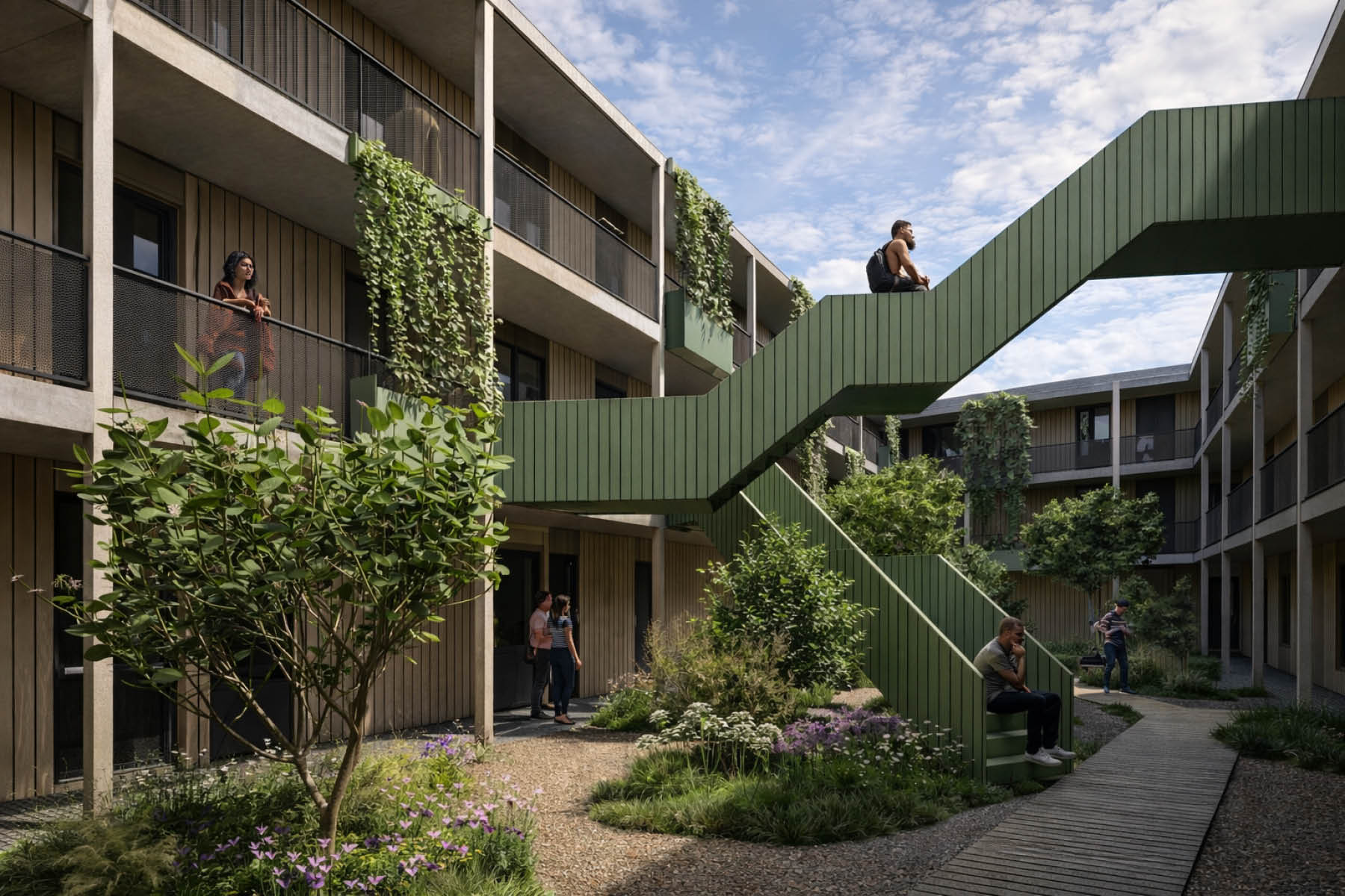 Centraal in het plan ligt een groene binnentuin. Via een entreepoort aan de bestaande groenstructuur wordt de tuin toegankelijk gemaakt. Galerijen en een verbindende trap stimuleren ontmoeting tussen bewoners en versterken het gemeenschapsgevoel. Vaste beplanting zorgt voor een blijvend groen karakter en een prettige, natuurlijke sfeer.
